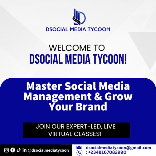 DSocial Media Tycoon is an innovative Ed-tech startup based in Lagos, Nigeria. We provide comprehensive training in social media management for aspiring social media managers, business owners, and content creators.