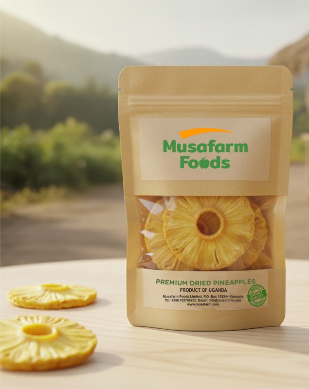 Musafarm Foods is a Ugandan agribusiness turning locally grown fruits into healthy, affordable food products while improving the lives of smallholder farmers. We work closely with farmers to reduce post-harvest losses, increase incomes, and create fair, reliable markets for their produce. Our products include dried pineapple slices, dried mango snacks, fresh pineapples, fresh mangos and fresh avocados, all made using eco-friendly and energy-efficient methods.