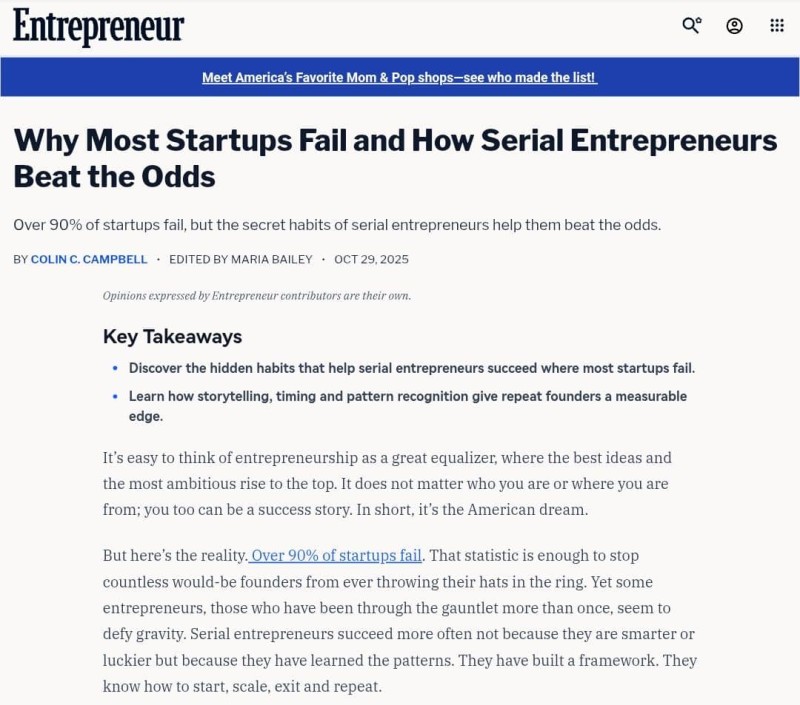 Discover the secret habits that help serial entrepreneurs succeed where most startups fail. Full article here: https://www.entrepreneur.com/leadership/why-most-startups-fail-and-how-serial-entrepreneurs-beat/498384