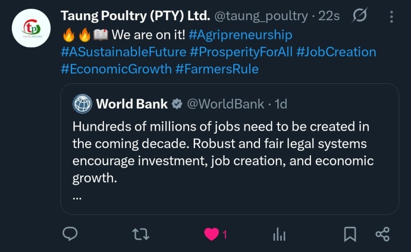 #JobCreation #ProsperityForAll #PovertyReduction #Agripreneurship #Sustainability #WorldBank #TaungPoultry #WomenInAgribusiness #YouthEmpowerment