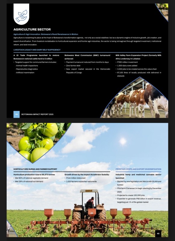 Agriculture is at the top of the nation's priority sectors; reclaiming it's place at the heart of Botswana's transformation agenda, not as a "social stabiliser", but as a dynamic engine of inclusive growth, job creation and export diversification.
